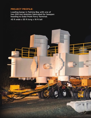 PROJECT PROFILE: Loading barge in Patricia Bay with one of two 250-ton dolphins fabricated for Seaspan heading to Duke Point Ferry Terminal. 45 ft wide x 55 ft long x 16 ft tall